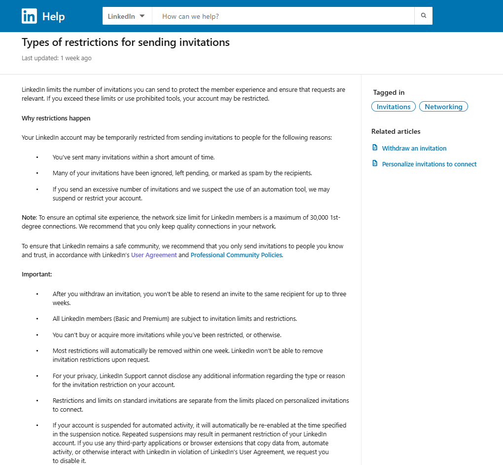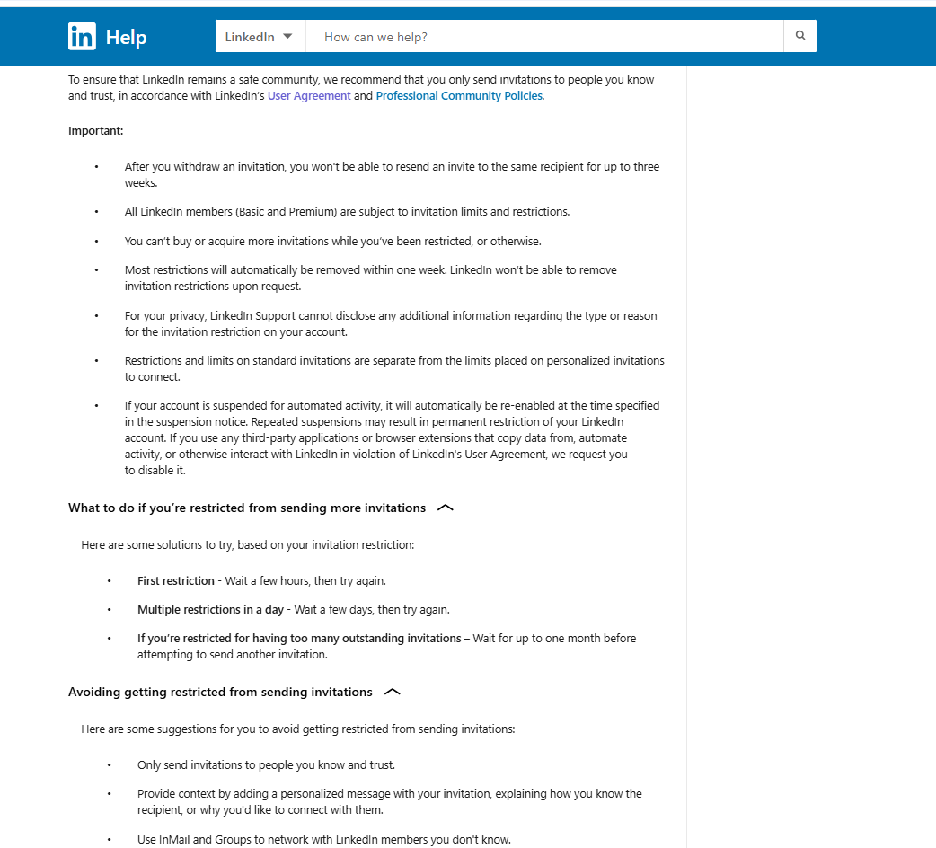 (For more information: LinkedIn - Types of restrictions for sending invitations)